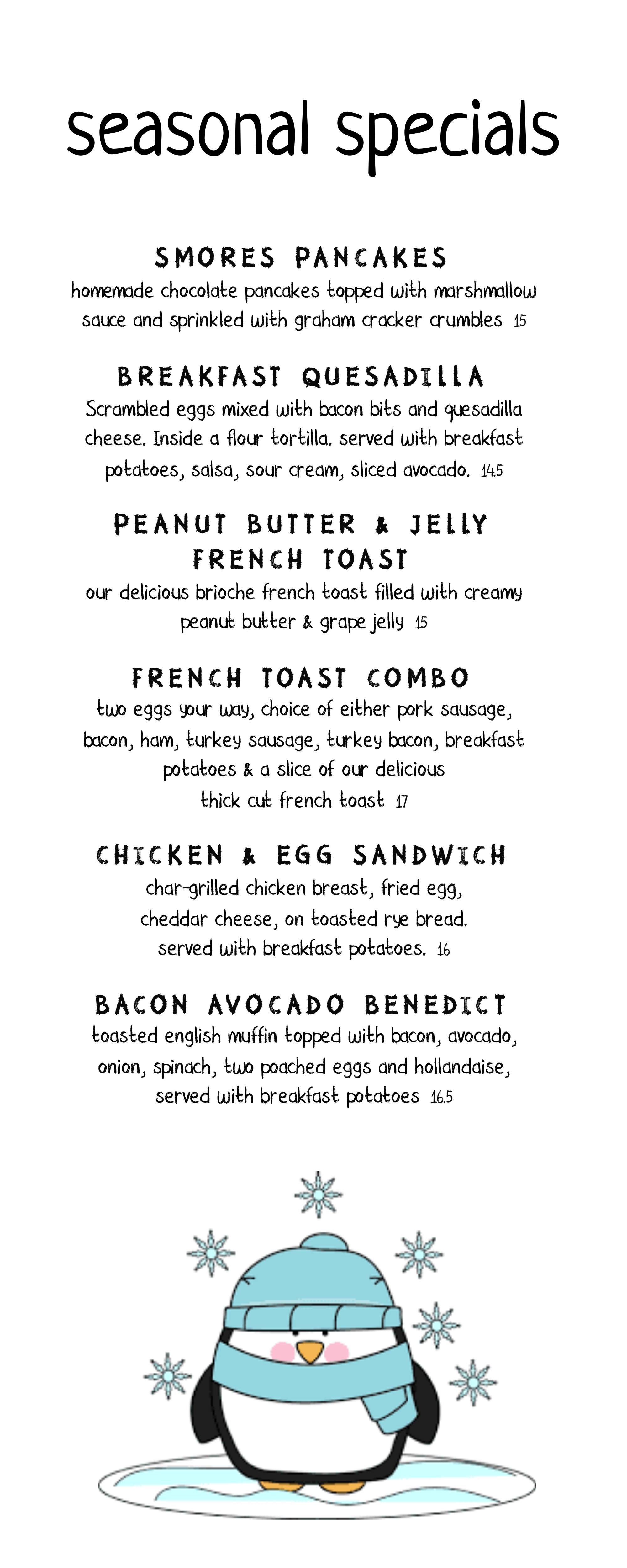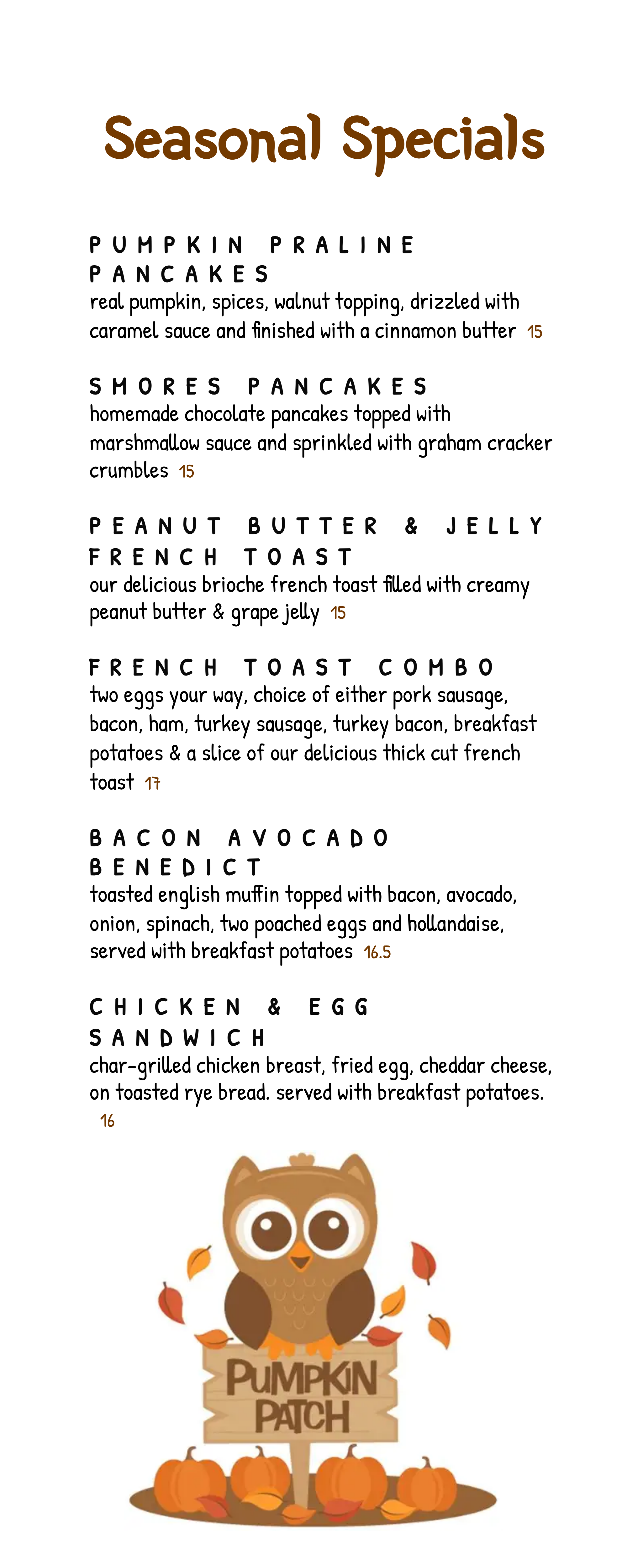 $7.50 Choose from one of the following: Pancakes, French Toast, Chicago Way-(egg, protein, potatoes), Grilled Cheese, Yogurt with FruitThe Amazing Skillets